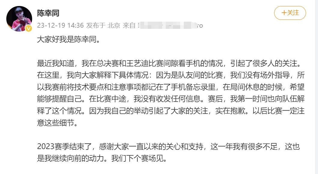 事件发酵几天后,12月19日下昼陈幸同发文,解说比赛本事看手机原因,暗意赛后她第一时刻向国乒解说了手机事件,答应以后比赛一定会精湛这些细节,还说“咱们下个赛场见”。