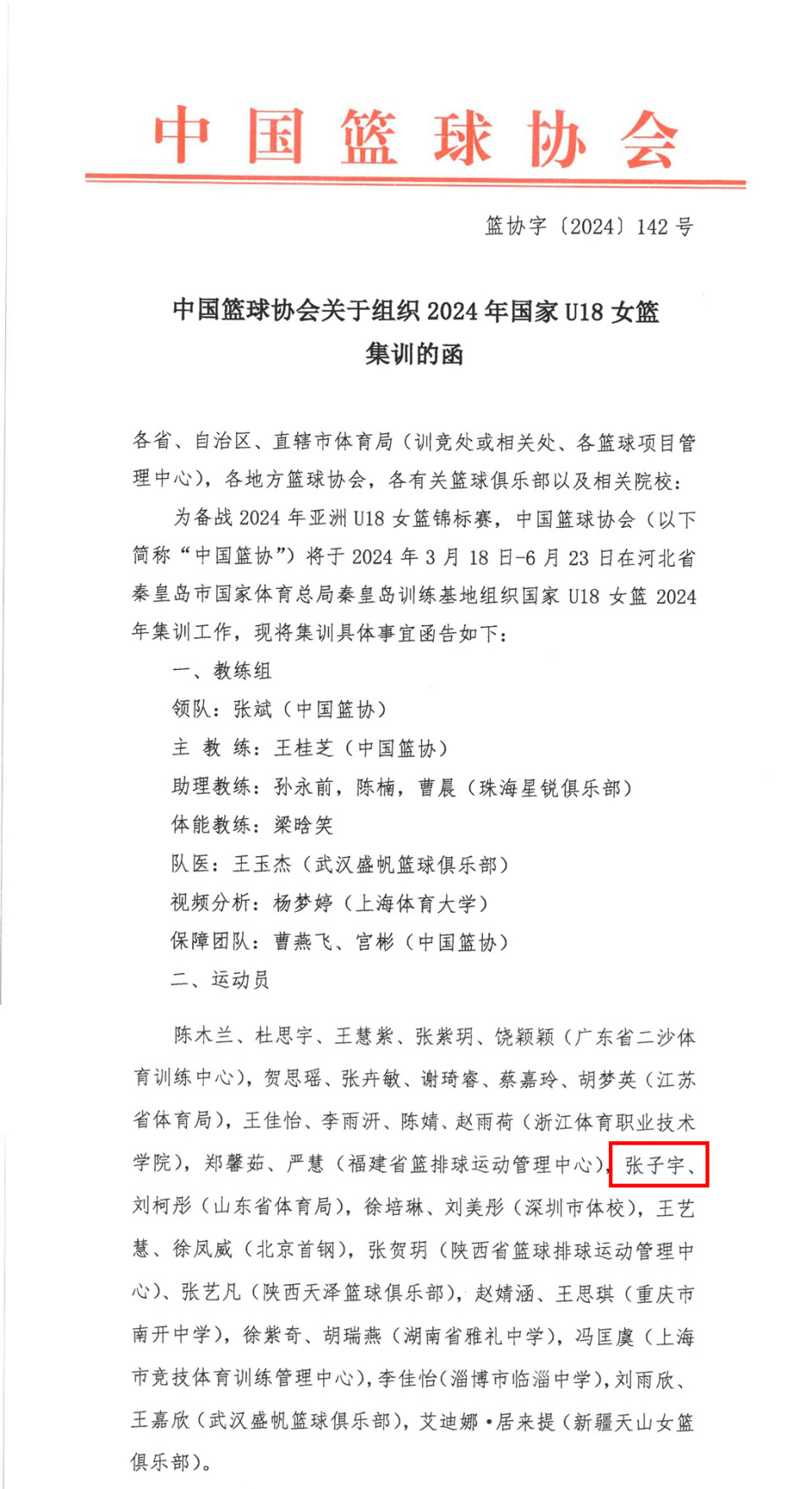 中国篮协发布公告,为了备战2024年亚洲U18女篮锦标赛,中国篮协将在河北省秦皇岛市国度体育总局秦皇岛熟识基地运转组织国度U18女篮的2024年集训使命,主教导由王桂芝担任,领队由张斌担任,集训队员系数有33名,这份球员名单中昭着写着“张子宇”的名字,与她沿途出自山东体育局的还有刘柯彤,那么这亦然张子宇第一次入选国度队,按照张子宇畴昔一两年在寰宇各项大赛的个东说念主数据和球队战绩来看,张子宇最终顺利入选中国U18女篮,简直是莫得任何悬念的,那么她也有契机初次代表国度队缔造U18女篮亚锦赛